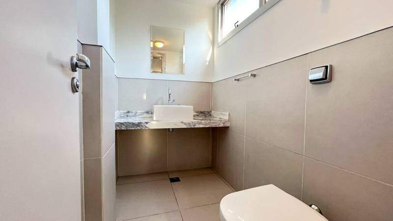Área de serviço independente, com armários e banheiro de apoio.