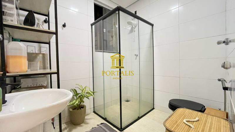 Banheiro social com pia em coluna, espelho, armários e box em blindex