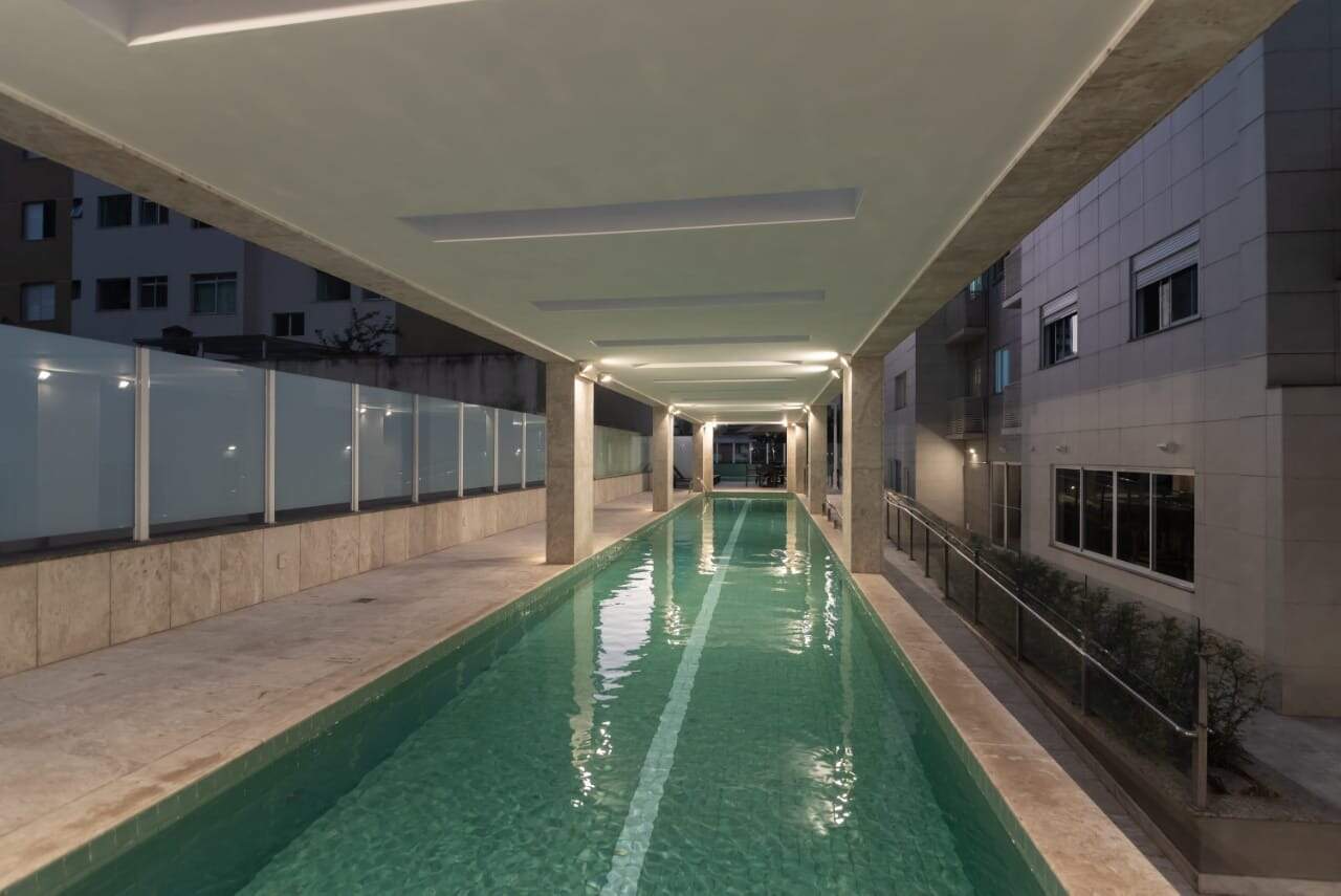 O prédio de alto padrão é todo revestido em porcelanato polido, conta com área de lazer completa incluindo salão de festas, espaço gourmet, barbecue, academia, sala de massagem, sauna, espaço kids, playground, quadra poliesportiva, piscina de raia coberta e aquecida, piscina infantil, além de poço artesiano.