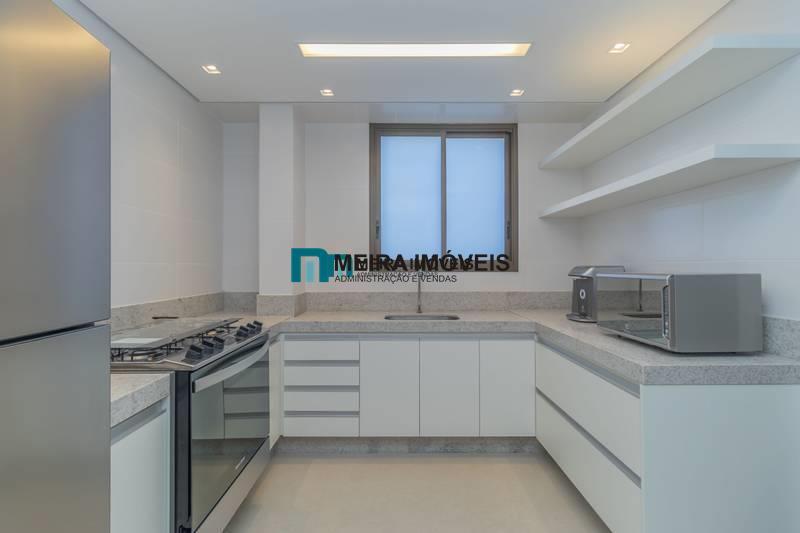 Cozinha funcional, equipada com bancada em granito e piso em porcelanato.