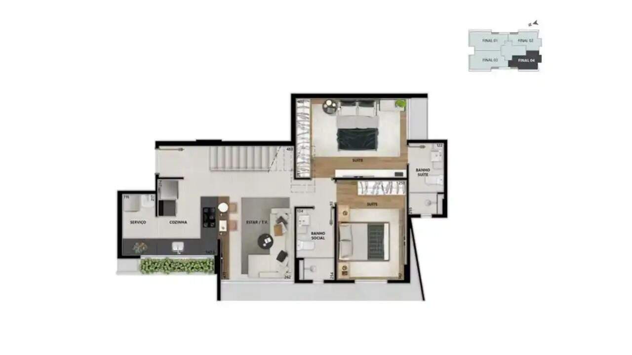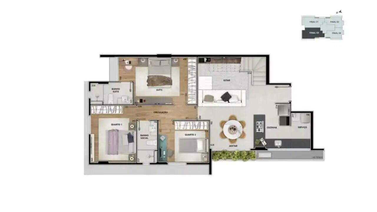 Apartamentos com metragens que variam de 63m² a 185m², de 2 e 3 quartos, bem distribuídos e iluminados, com sala para dois ambientes, cozinha integrada, lavabo, suíte máster e área de serviço independente.