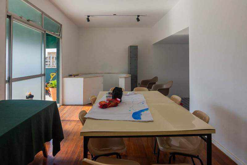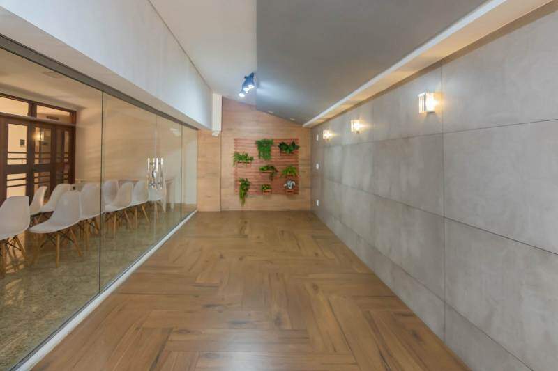 Ampla sala com piso em tábua corrida, versátil para home office, sala de TV ou espaço de convivência.