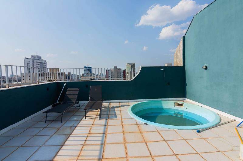 Cobertura com espaço descoberto, piscina privativa e sauna.