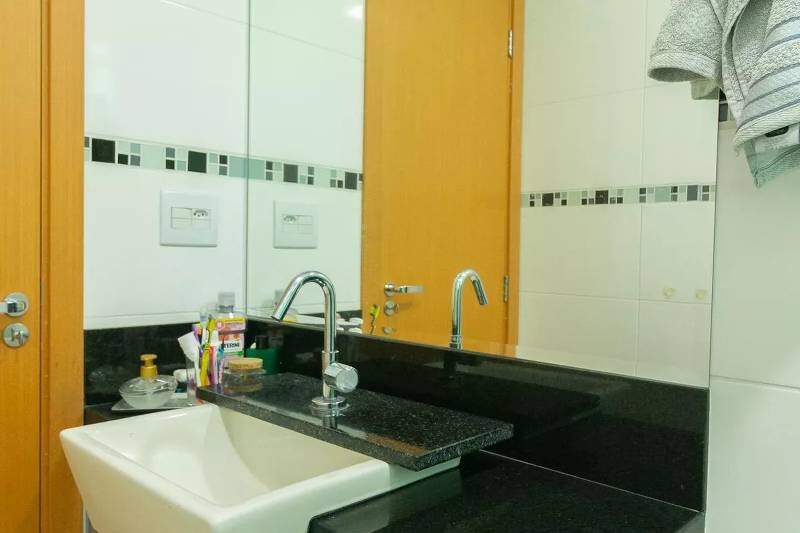 Banheiro social com bancada em granito, armários, espelho e box em blindex