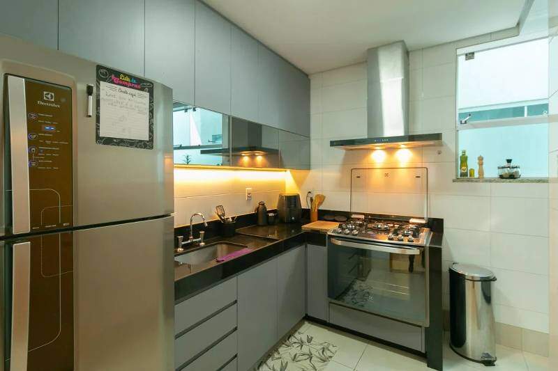 Cozinha com bancada em granito, piso em cerâmica, armários planejados e coifa