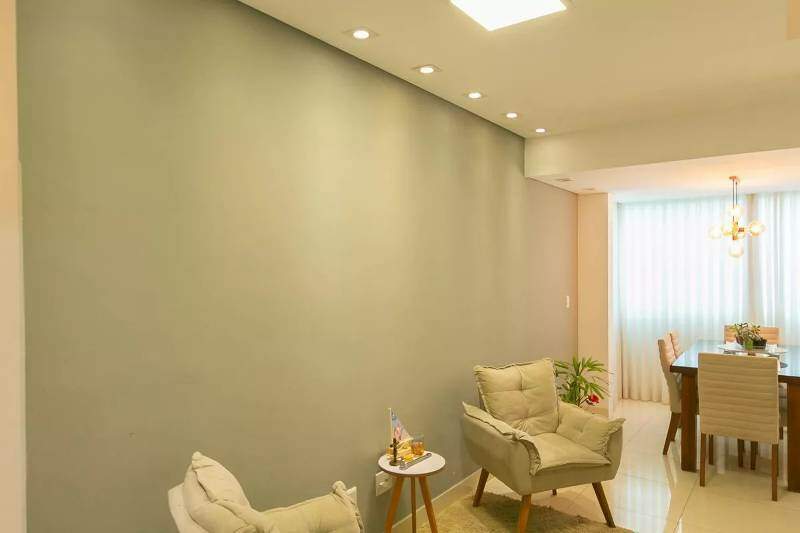 1 Sala ampla para dois ambientes com piso em cerâmica, teto com rebaixamento em gesso e iluminação planejada