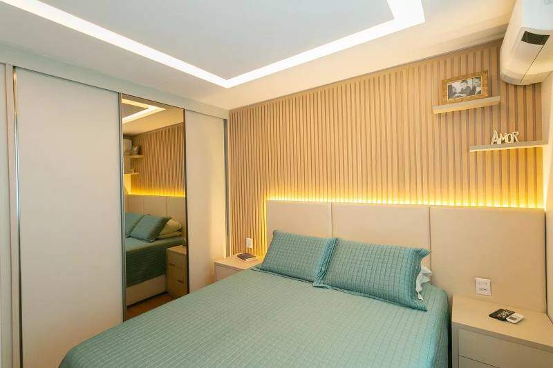 1 Sala ampla para dois ambientes com piso em porcelanato, teto com rebaixamento em gesso e iluminação planejada